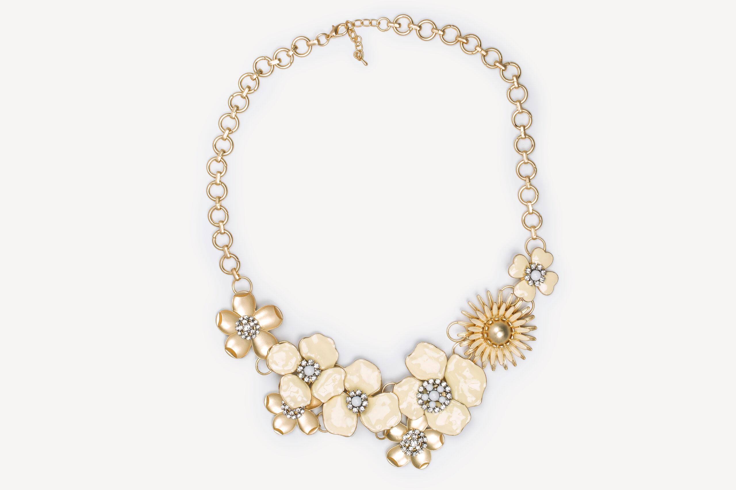 Our Crescent Link Necklace is adorned with lovely gold flowers with inset diamonds. 18k Yellow Gold